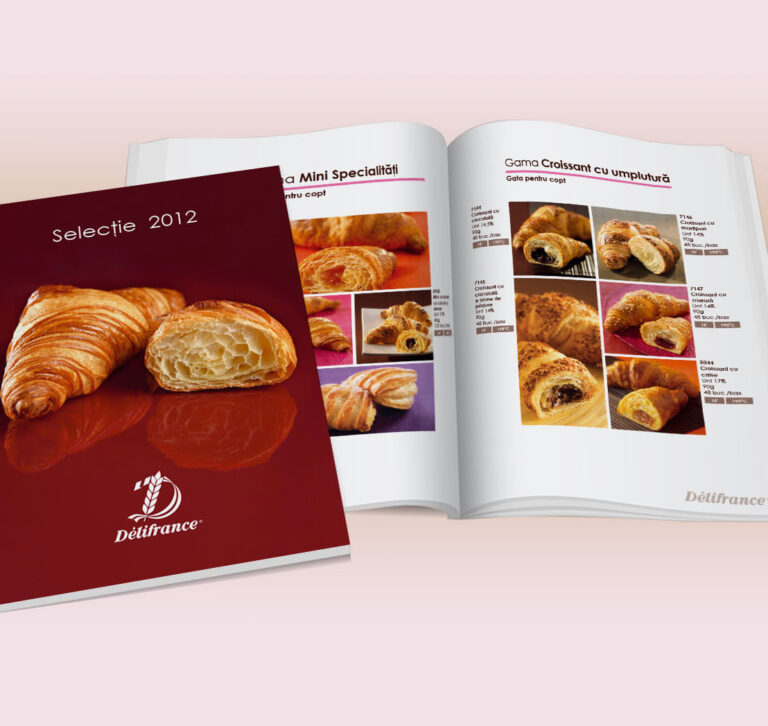 Delifrance is a company specialized in producing pastry products (fresh or frozen). This was a product catalogue. It was reissued every year with new products and layout adaptations. I was in charge with layout design, Artwork and DTP. The doubling you might see in middle of the spread is the gutter needed to compensate for …